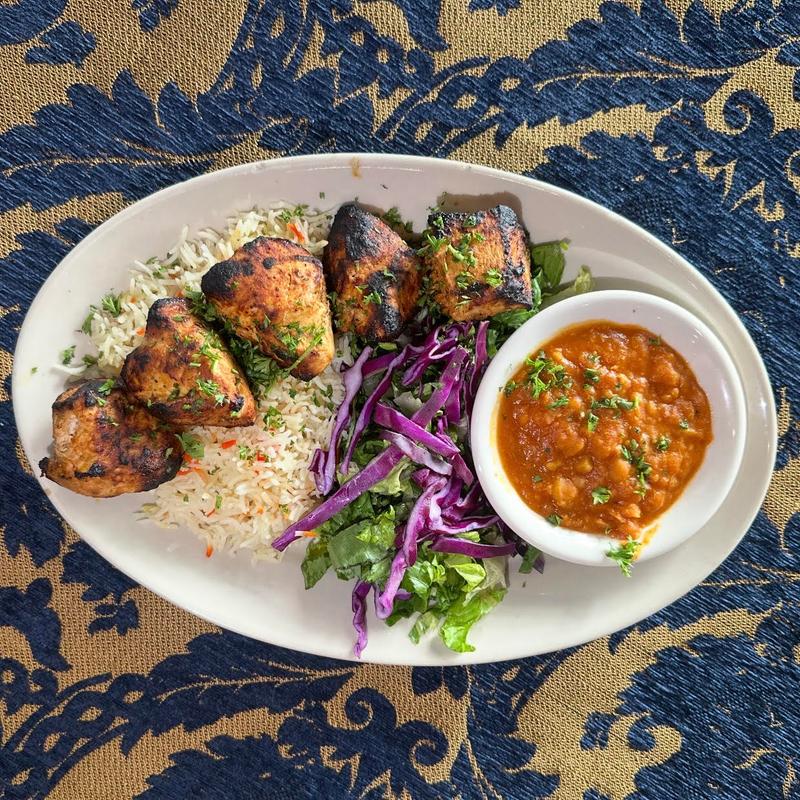 Grilled chicken kabob (pieces) served over basmati rice with a side of slow-cooked chickpea stew.