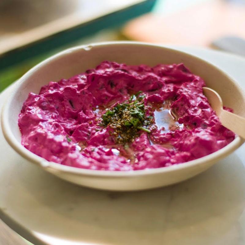 Tender beets mixed with yogurt and lemon, garnished with parsley.