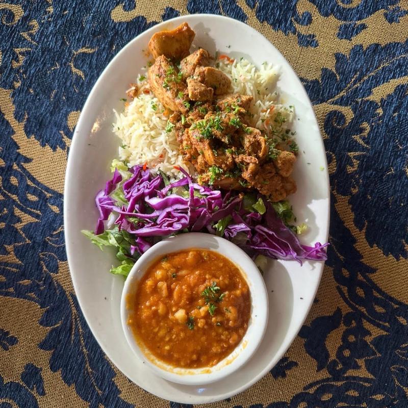 A bed of basmati rice served with a side of slow-cooked chickpea stew with chicken shawarma.